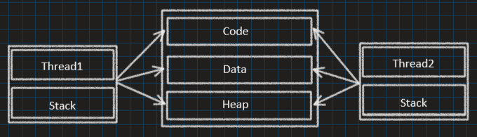 스레드란 "프로세스가 할당받은 자원의 단위를 이야기 하며 , 프로세스 내에서 각각 Stack만 따로 할당받고 Code, Data, Heap 영역은 공유한다."